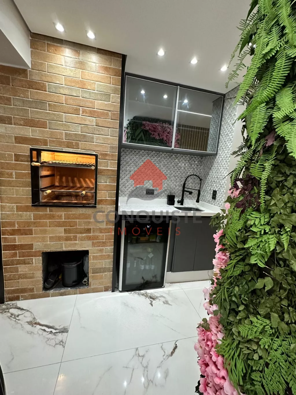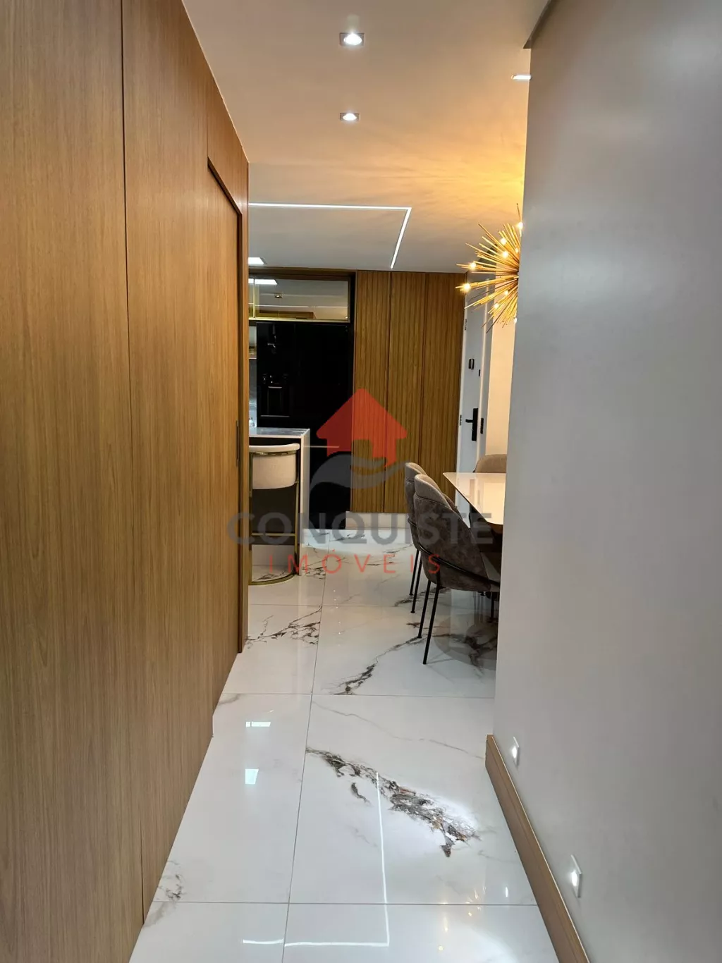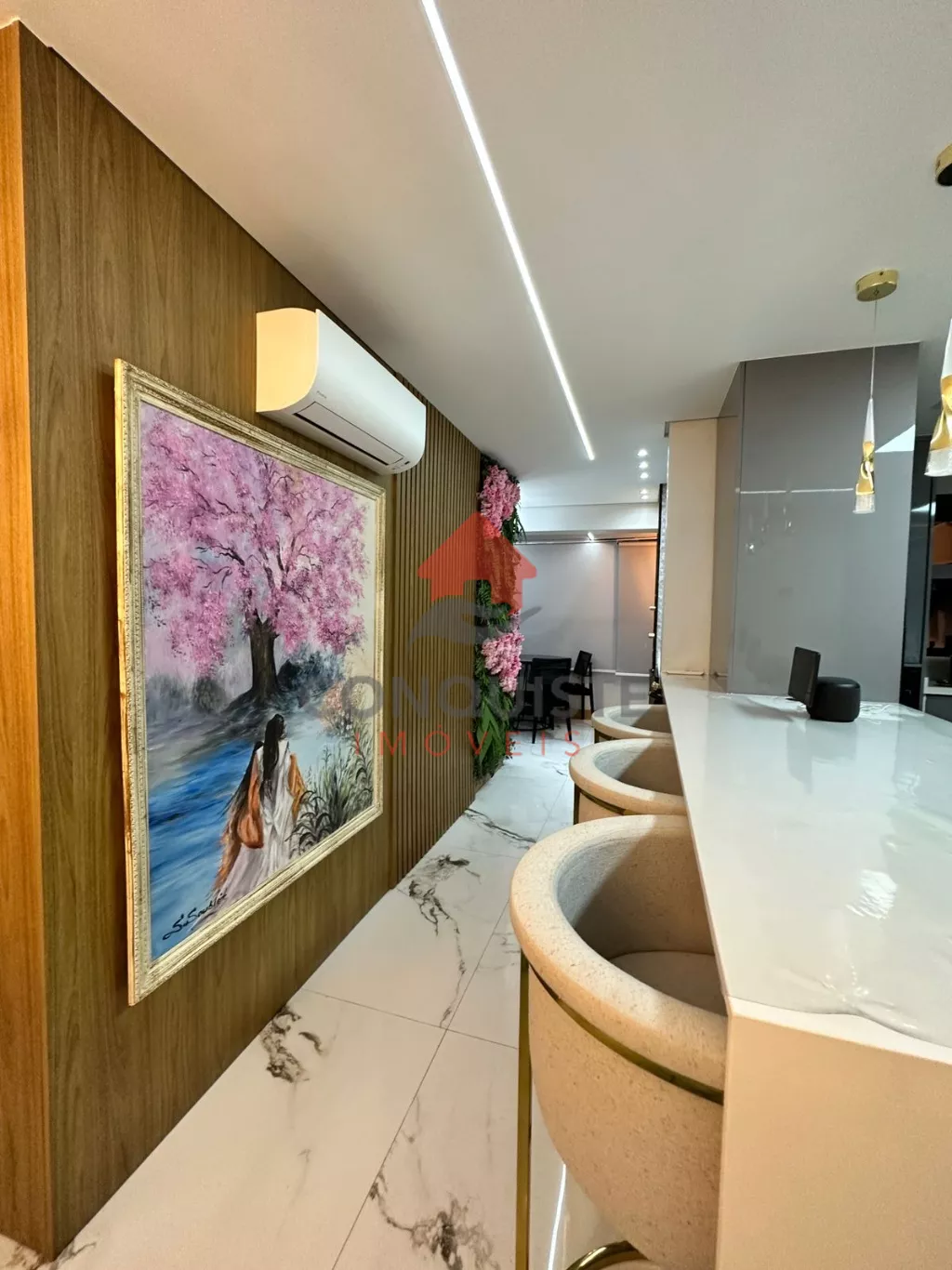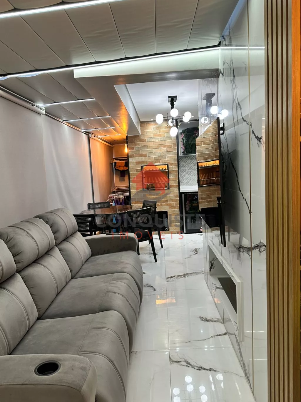 Home em marmore calacata com lareira com acionamento por controle