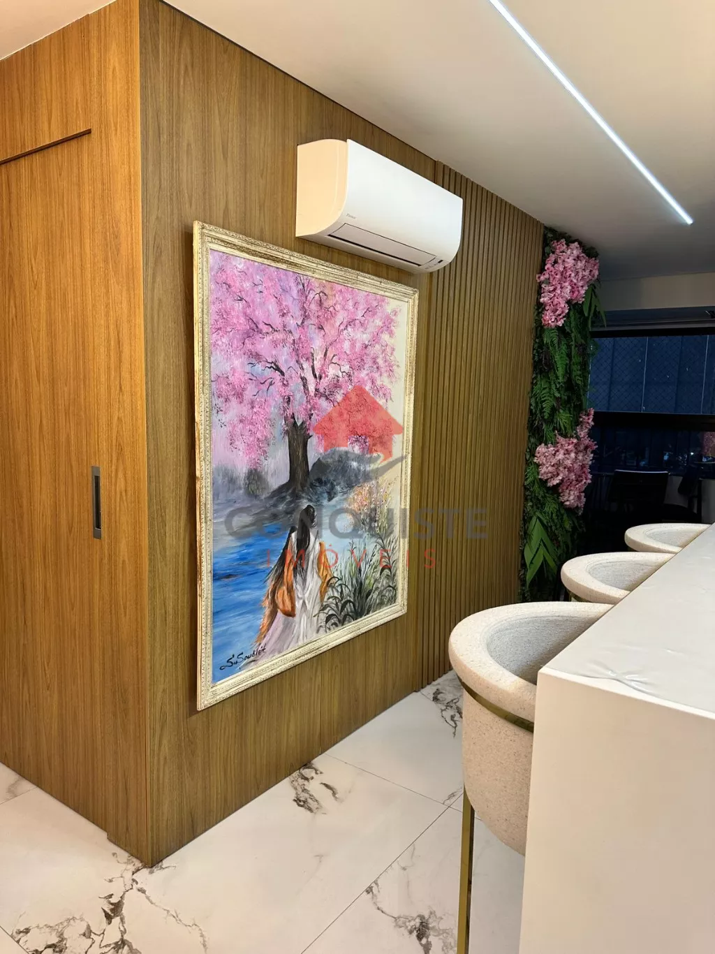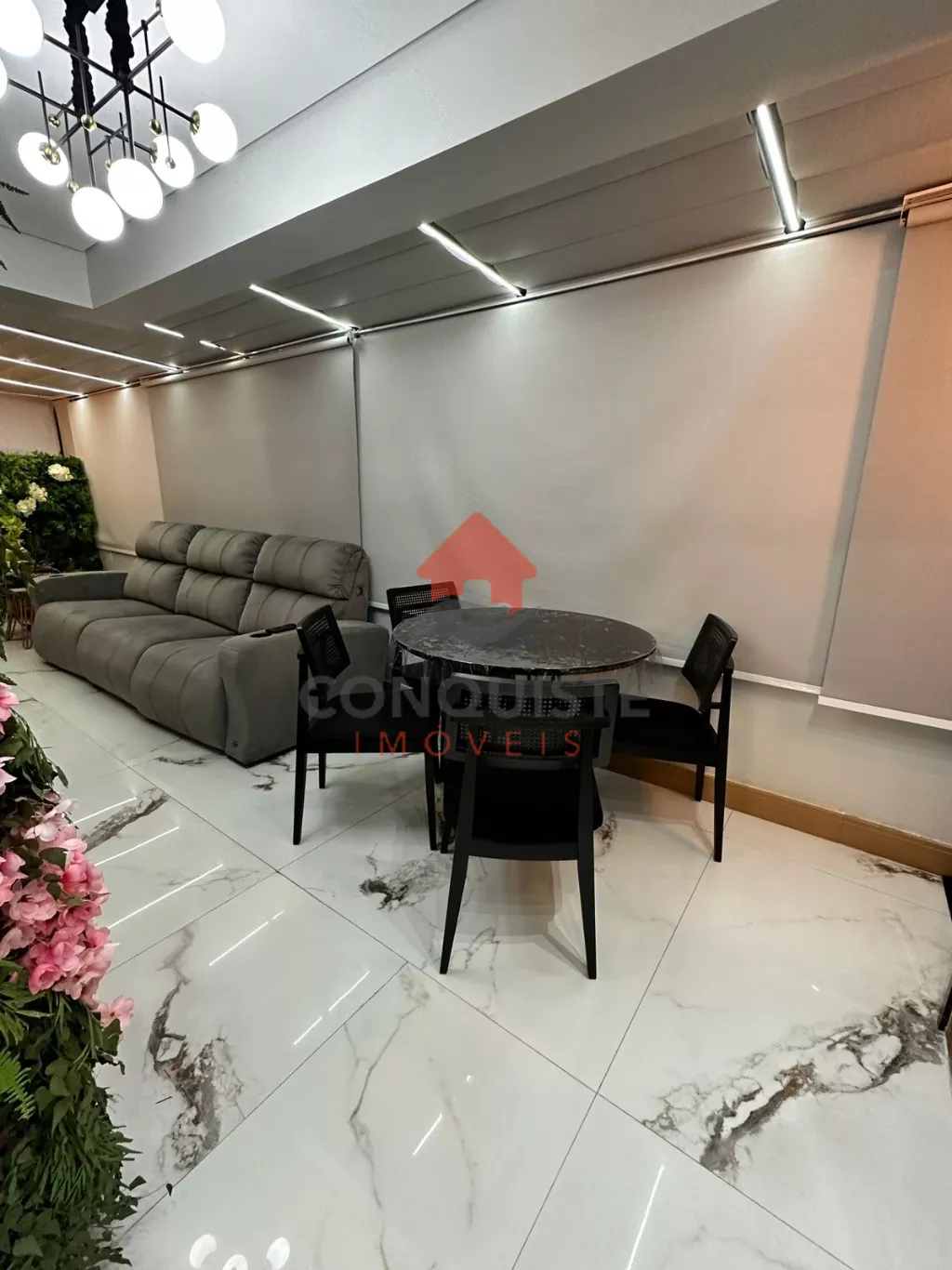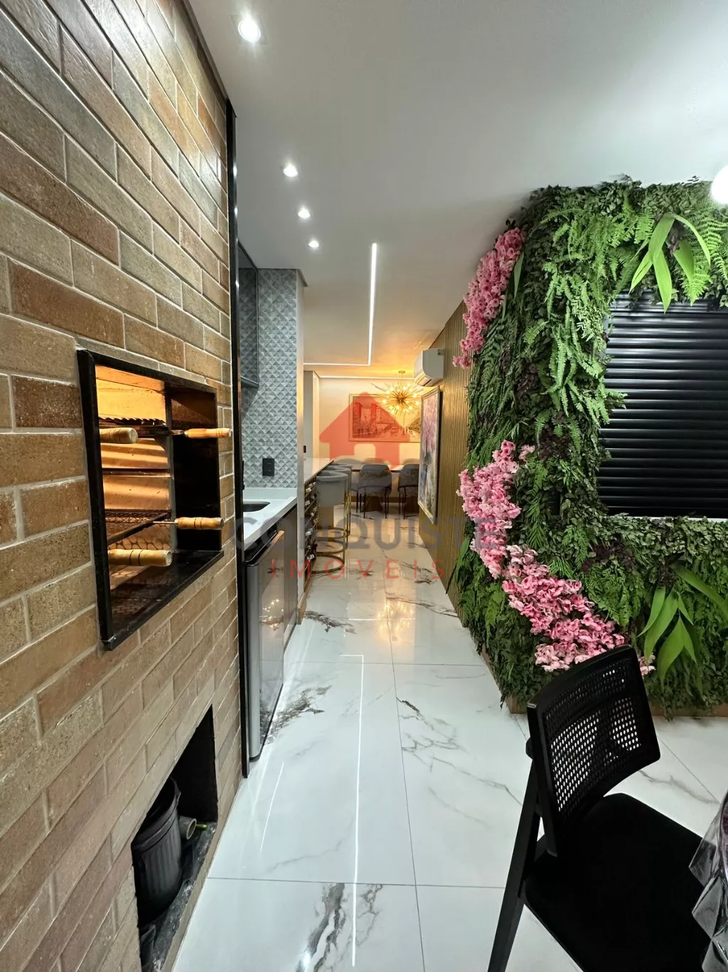 Home em marmore calacata com lareira com acionamento por controle
