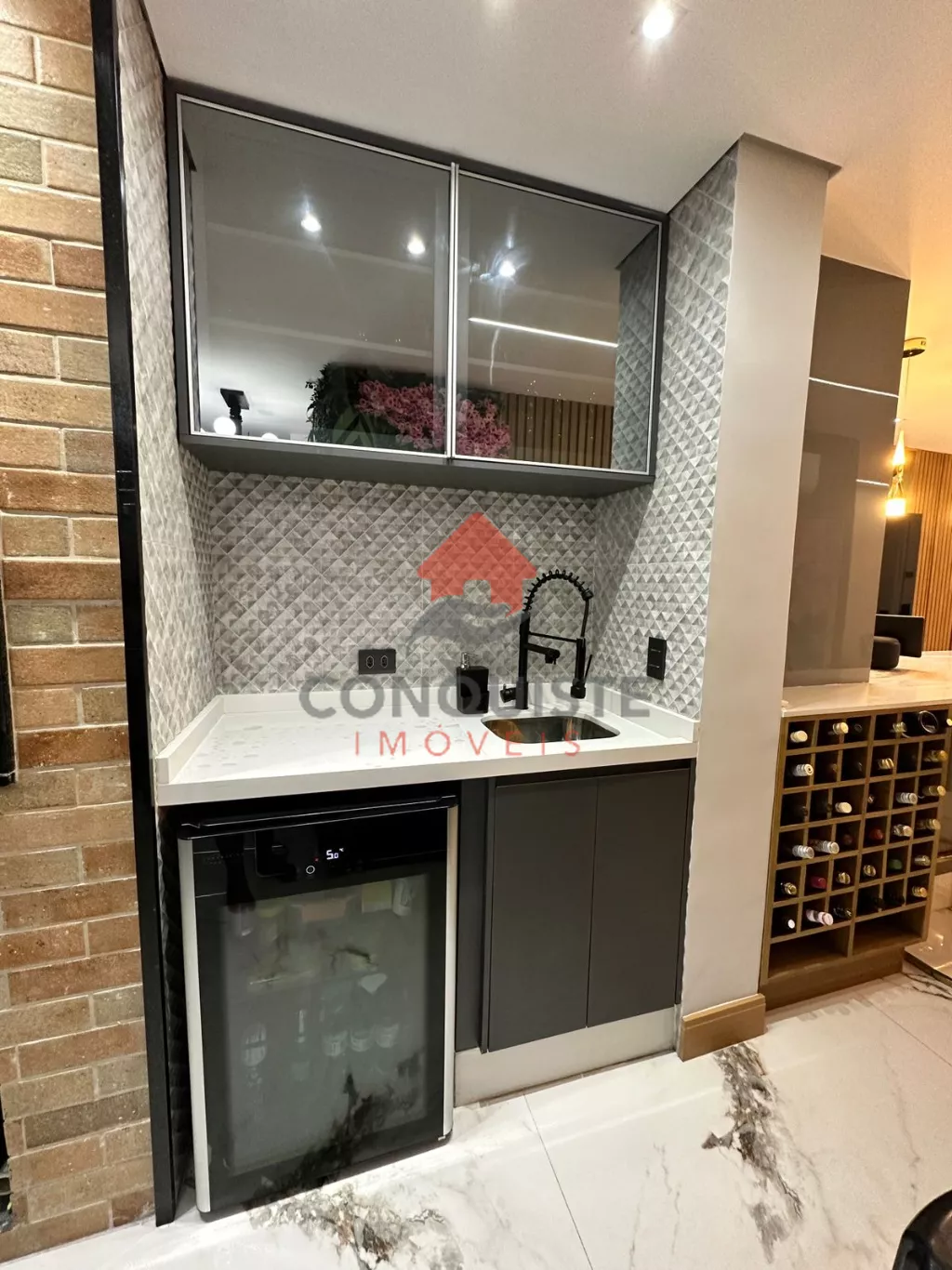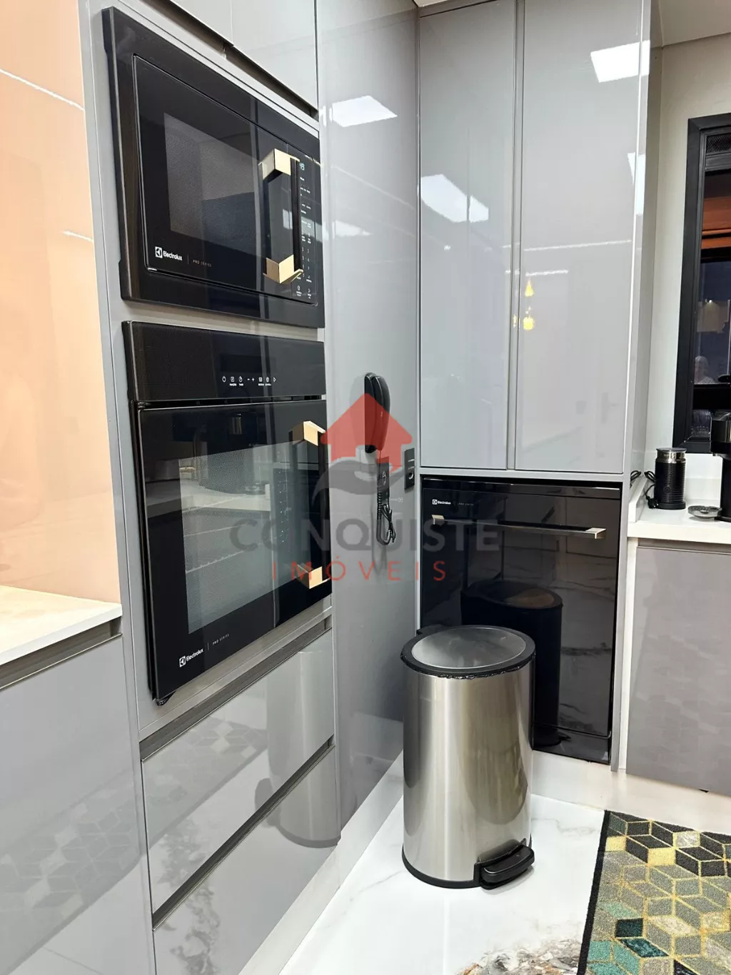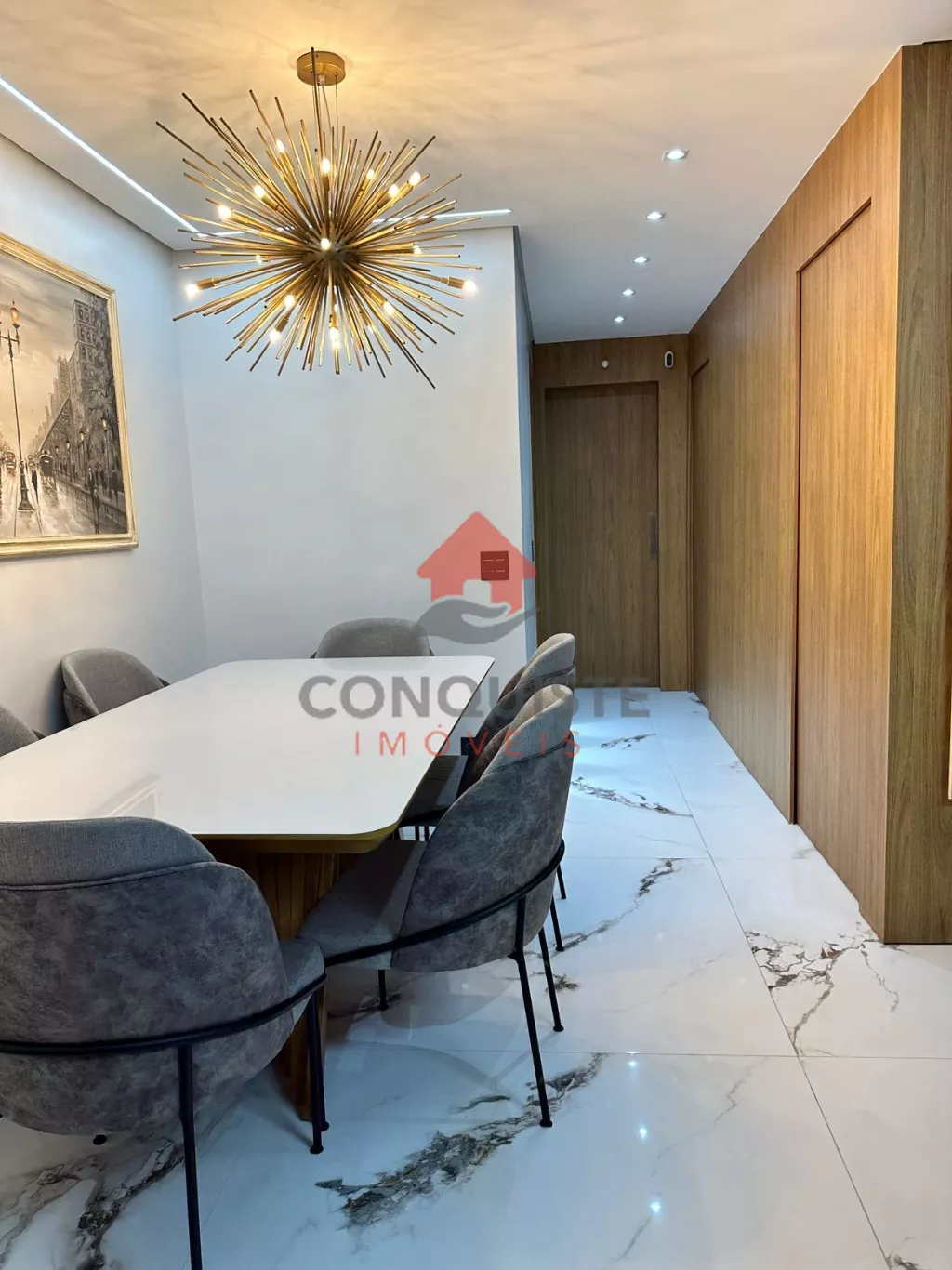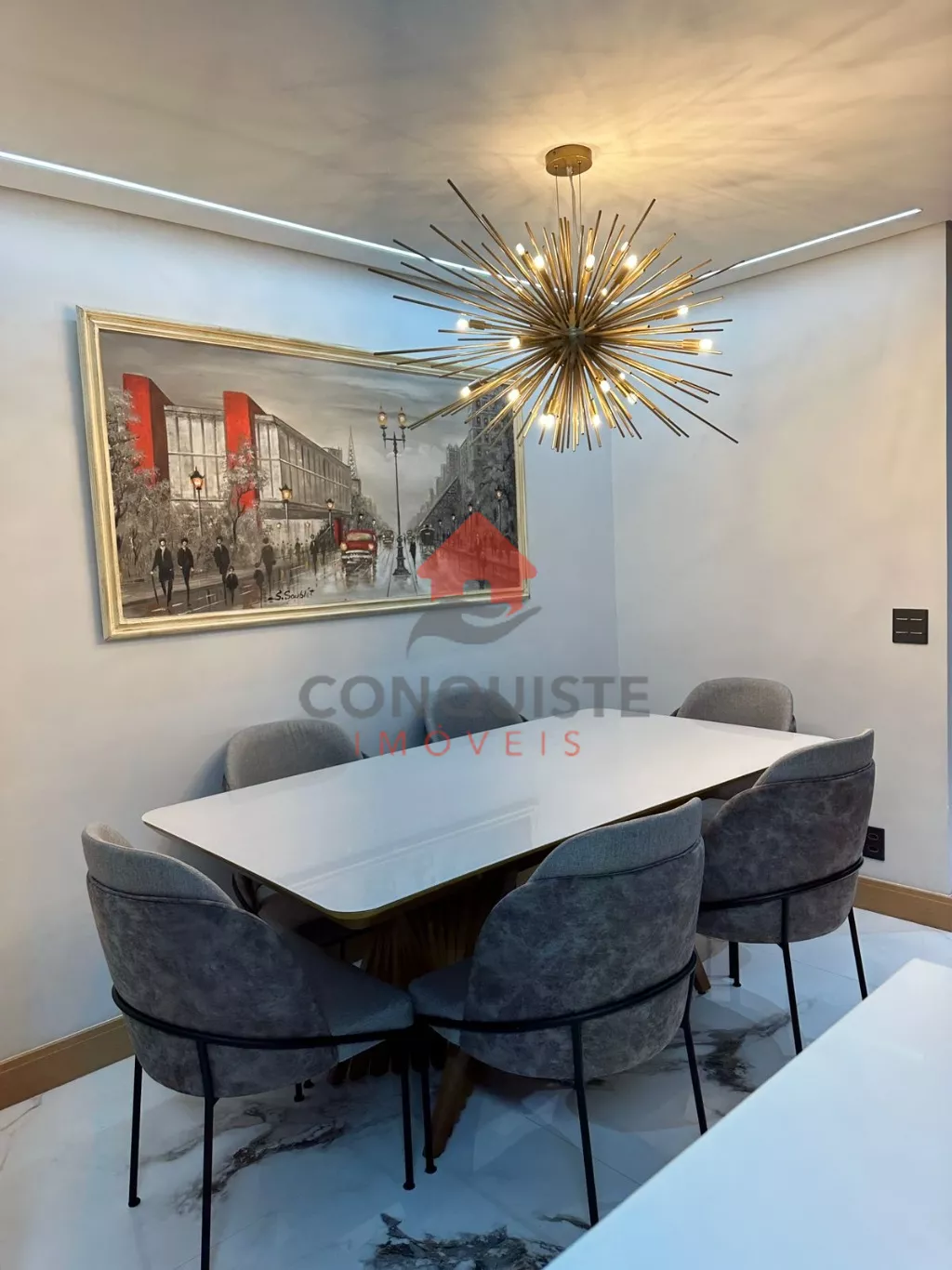 Home em marmore calacata com lareira com acionamento por controle